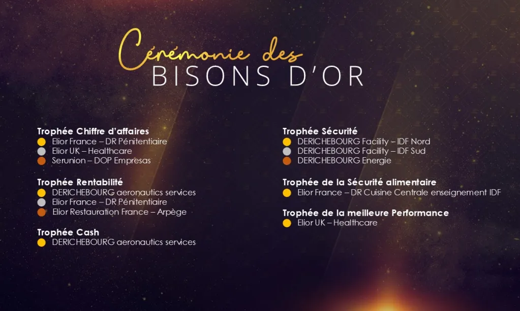 Les filiales d’Elior et de DERICHEBOURG Multiservices ont été récompensées dans trois catégories majeures : le chiffre d’affaires, la rentabilité et la sécurité. Pour chacune d’elles, trois équipes sont montées sur le podium et ont reçu des trophées or, argent et bronze, réalisés par le sculpteur Jean No.